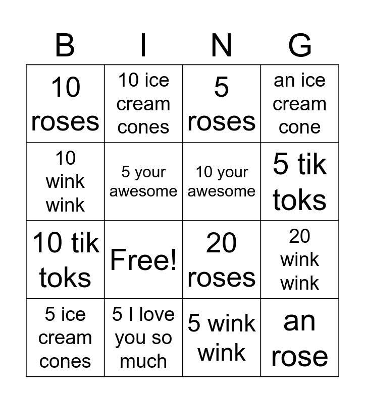 This bingo card has 18 words: Free!, an rose, 5 roses, 10 roses, 20 roses, an ice cream cone, 5 ice cream cones, 10 ice cream cones, 5 tik toks, 10 tik toks, 5 wink wink, 10 wink wink, 20 wink wink, 5 your awesome, 10 your awesome, 20 your awesome, 5 I love you so much and 10 I love you so much.