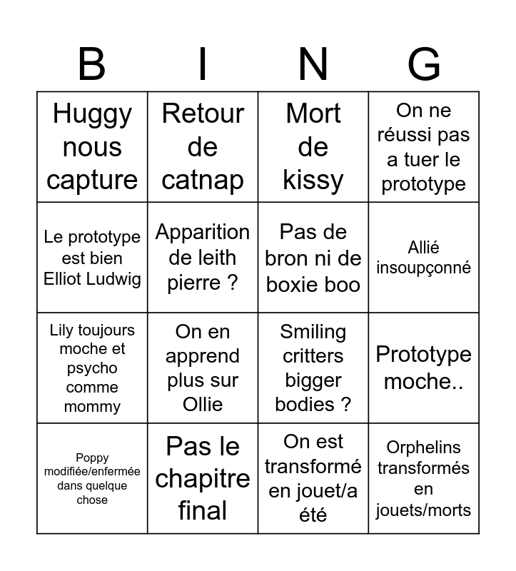 This bingo card has 16 words: Pas le chapitre final, Prototype moche.., Mort de kissy, Huggy nous capture, Lily toujours moche et psycho comme mommy, Retour de catnap, Smiling critters bigger bodies ?, On est transformé en jouet/a été, Le prototype est bien Elliot Ludwig, Apparition de leith pierre ?, Poppy modifiée/enfermée dans quelque chose, On ne réussi pas a tuer le prototype, On en apprend plus sur Ollie, Allié insoupçonné, Pas de bron ni de boxie boo and Orphelins transformés en jouets/morts.