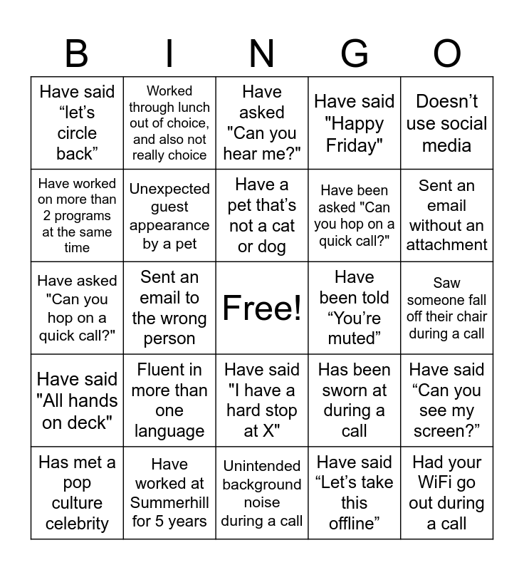 This bingo card has a free space and 24 words: Fluent in more than one language, Have worked at Summerhill for 5 years, Have a pet that’s not a cat or dog, Has met a pop culture celebrity, Doesn’t use social media, Have said “let’s circle back”, Have worked on more than 2 programs at the same time, Worked through lunch out of choice, and also not really choice, Have been told “You’re muted”, Have said "I have a hard stop at X", Have been asked "Can you hop on a quick call?", Have asked "Can you hop on a quick call?", Has been sworn at during a call, Have said “Can you see my screen?”, Unexpected guest appearance by a pet, Have said “Let’s take this offline”, Saw someone fall off their chair during a call, Have asked "Can you hear me?", Sent an email without an attachment, Sent an email to the wrong person, Had your WiFi go out during a call, Have said "All hands on deck", Have said "Happy Friday" and Unintended background noise during a call.