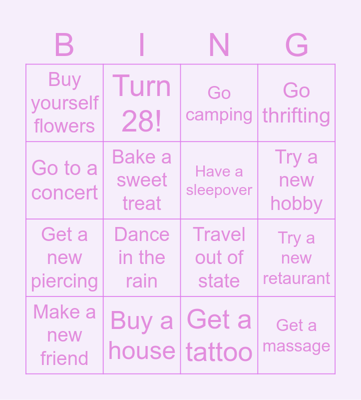This bingo card has 16 words: Buy a house, Try a new retaurant, Go camping, Buy yourself flowers, Get a new piercing, Turn 28!, Travel out of state, Get a tattoo, Go to a concert, Bake a sweet treat, Make a new friend, Go thrifting, Dance in the rain, Try a new hobby, Have a sleepover and Get a massage.