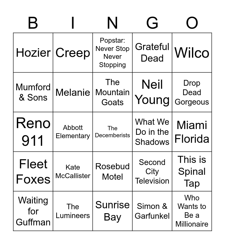 This bingo card has 59 words: Andrew Bird, The Lumineers, The Avett Brothers, Fleet Foxes, Simon & Garfunkel, Bob Dylan, Melanie, Kansas, Neil Young, The Kinks, Grateful Dead, George Harrison, Mumford & Sons, Bon Iver, alt-J, Hozier, The Decemberists, Wilco, The Shins, The Mountain Goats, What We Do in the Shadows, Popstar: Never Stop Never Stopping, Waiting for Guffman, This is Spinal Tap, Surf’s Up, District 9, A Mighty Wind, Best in Show, Drop Dead Gorgeous, Behind the Mask: The Rise of Leslie Vernon, Nirvana the Band the Show the Movie, A Hard Day’s Night, Cunk on Earth, The Blair Witch Project, Creep, The Office, Parks & Recreation, Abbott Elementary, Arrested Development, Reno 911, Moira Rose, Kate McCallister, Miami Florida, Delia Deetz, Sally, Herb Ertlinger, The Crows, The Studio, Rosebud Motel, Sunrise Bay, Mid Atlantic, Norwich Terrier, The Last of Us, When Marnie Was There, A Series of Unfortunate Events, Second City Television, After Hours, Who Wants to Be a Millionaire and Schitt’s Creek.