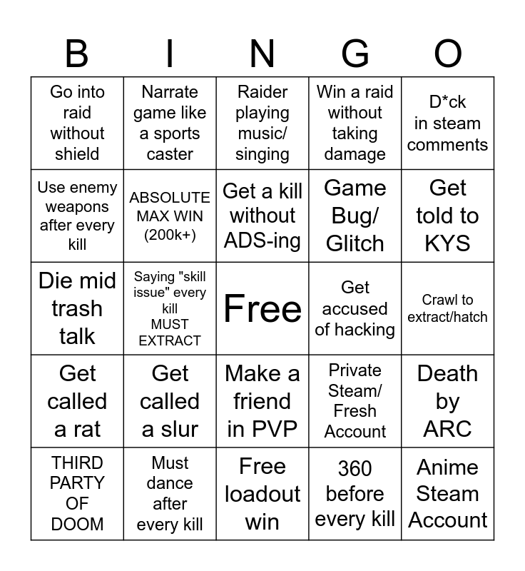 This bingo card has a free space and 24 words: Get called a slur, Must dance after every kill, Get a kill without ADS-ing, THIRD PARTY OF DOOM, D*ck in steam comments, Go into raid without shield, Use enemy weapons after every kill, Narrate game like a sports caster, Get accused of hacking, Make a friend in PVP, Game Bug/ Glitch, Die mid trash talk, Private Steam/ Fresh Account, Death by ARC, ABSOLUTE MAX WIN (200k+), 360 before every kill, Crawl to extract/hatch, Raider playing music/ singing, Get told to KYS, Saying "skill issue" every kill MUST EXTRACT, Anime Steam Account, Get called a rat, Win a raid without taking damage and Free loadout win.