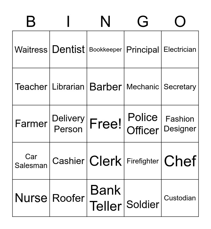 This bingo card has a free space and 25 words: Cashier, Bank Teller, Barber, Nurse, Electrician, Waitress, Teacher, Dentist, Police Officer, Clerk, Mechanic, Farmer, Firefighter, Chef, Librarian, Vet, Fashion Designer, Bookkeeper, Secretary, Delivery Person, Custodian, Roofer, Car Salesman, Principal and Soldier.