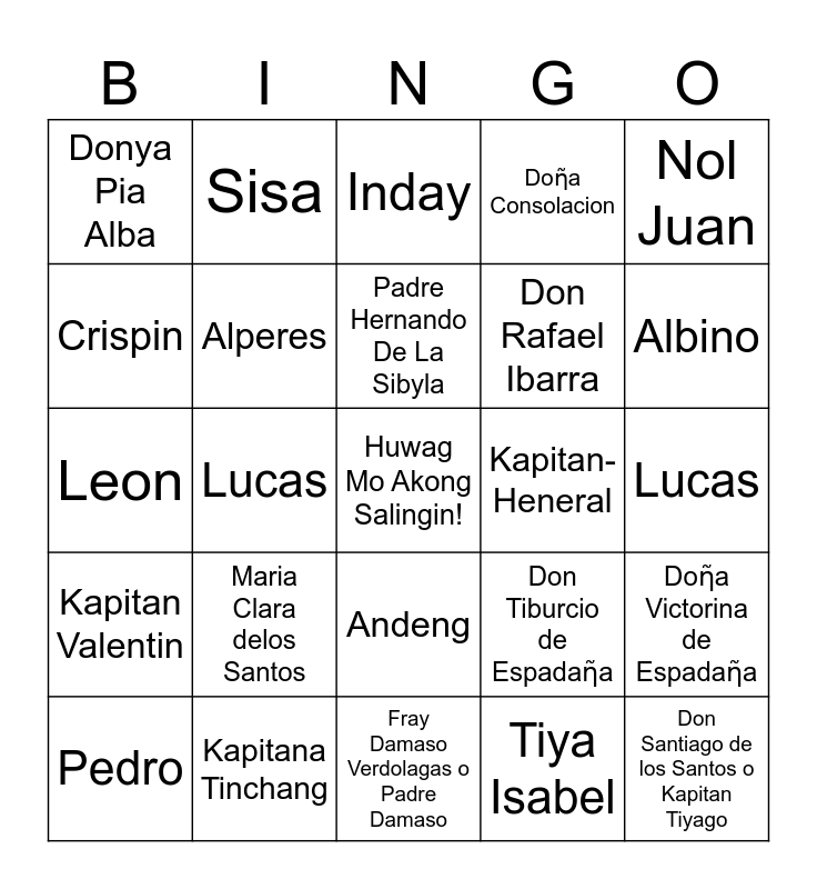 This bingo card has a free space and 50 words: Juan Crisostomo Magsalin Ibarra, Don Santiago de los Santos o Kapitan Tiyago, Elias, Fray Damaso Verdolagas o Padre Damaso, Maria Clara delos Santos, Don Anastacio o Pilosopo Tasyo, Sisa, Basilio, Crispin, Tinyente Guevarra, Alperes, Doῆa Consolacion, Doῆa Victorina de Espadaῆa, Don Tiburcio de Espadaῆa, Linares, Padre Bernardo Salvi, Padre Hernando De La Sibyla, Kapitan-Heneral, Don Filipo, Nol Juan, Lucas, Tiya Isabel, Donya Pia Alba, Don Rafael Ibarra, Don Pedro Eibarramendia, Mang Pablo, Albino, Kapitana Maria, Inday, Andeng, Victoria, Neneng, Sinang, Hermana Rufa, Kapitana Tinchang, Padre Florentino, Don Saturnino Ibarra, Don Pedro Eibarramendia, Kapitan Basilio, Lucas, Mang Pablo, Balat, Tarsilo / Bruno, Kapitan Pablo, Pedro, Leon, Don Primitivo, Kapitan Tinong, Kapitan Valentin and Juan Crisostomo Magsalin Ibarra, Don Santiago de los Santos o Kapitan Tiyago, Elias, Fray Damaso Verdolagas o Padre Damaso, Maria Clara delos Santos, Don Anastacio o Pilosopo Tasyo, Sisa, Basilio, Crispin, Tinyente Guevarra, Alperes, Doῆa Consol.