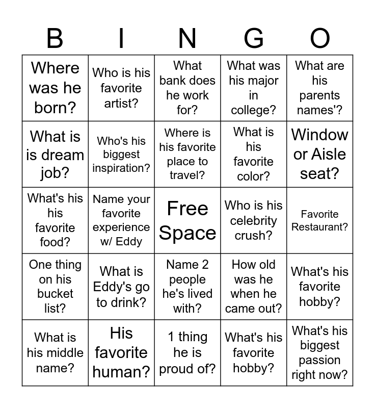 This bingo card has a free space and 24 words: What is Eddy's go to drink?, His favorite human?, Where is his favorite place to travel?, What is his middle name?, What are his parents names'?, Where was he born?, What is is dream job?, Who is his favorite artist?, Who is his celebrity crush?, Name 2 people he's lived with?, What is his favorite color?, What's his his favorite food?, How old was he when he came out?, What's his favorite hobby?, Who's his biggest inspiration?, What's his favorite hobby?, Favorite Restaurant?, What bank does he work for?, Window or Aisle seat?, Name your favorite experience w/ Eddy, What's his biggest passion right now?, One thing on his bucket list?, What was his major in college? and 1 thing he is proud of?.