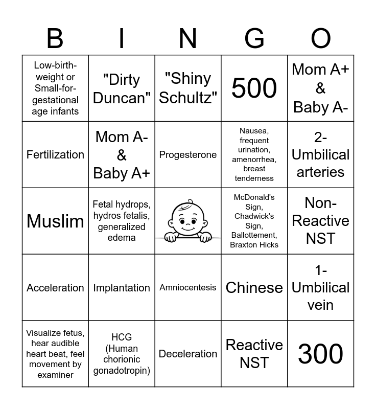 This bingo card has a free space and 24 words: Implantation, HCG (Human chorionic gonadotropin), Progesterone, Visualize fetus, hear audible heart beat, feel movement by examiner, Mom A+ & Baby A-, Low-birth-weight or Small-for-gestational age infants, Fertilization, "Dirty Duncan", McDonald's Sign, Chadwick's Sign, Ballottement, Braxton Hicks, Amniocentesis, Nausea, frequent urination, amenorrhea, breast tenderness, Muslim, Chinese, 1-Umbilical vein, Mom A- & Baby A+, Reactive NST, Non-Reactive NST, "Shiny Schultz", 2-Umbilical arteries, Fetal hydrops, hydros fetalis, generalized edema, 300, Acceleration, 500 and Deceleration.
