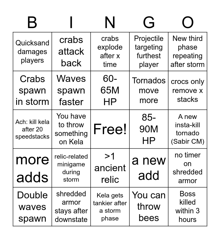 This bingo card has a free space and 35 words: Cannot move with "biting swarm", Bees aoe much larger, Portals used in first kill, Waves spawn faster, >1 ancient relic, Projectile targeting furthest player, Crabs spawn in storm, new debuff, 60-65M HP, Ach: kill kela after 6 storms, Ach: kill kela after 20 speedstacks, New third phase repeating after storm, A third phase after x% (like Sunqua Peak/Ura), Croc mechanic changes, Quicksand damages players, 85-90M HP, You can throw bees, You have to throw something on Kela, more adds, Boss killed within 3 hours, a new add, Double waves spawn, no timer on shredded armor, shredded armor stays after downstate, crabs explode after x time, crocs only remove x stacks, More tornados spawn earlier, Tornados are larger, Tornados move more, A new insta-kill tornado (Sabir CM), cave under arena utilized, Kela gets tankier after a storm phase, relic-related minigame during storm, crabs attack back and class stack (>6) for worlds first.