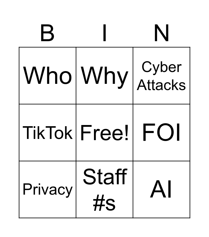 This bingo card has a free space and 8 words: FOI, Cyber Attacks, Why, Privacy, Who, AI, TikTok and Staff #s.