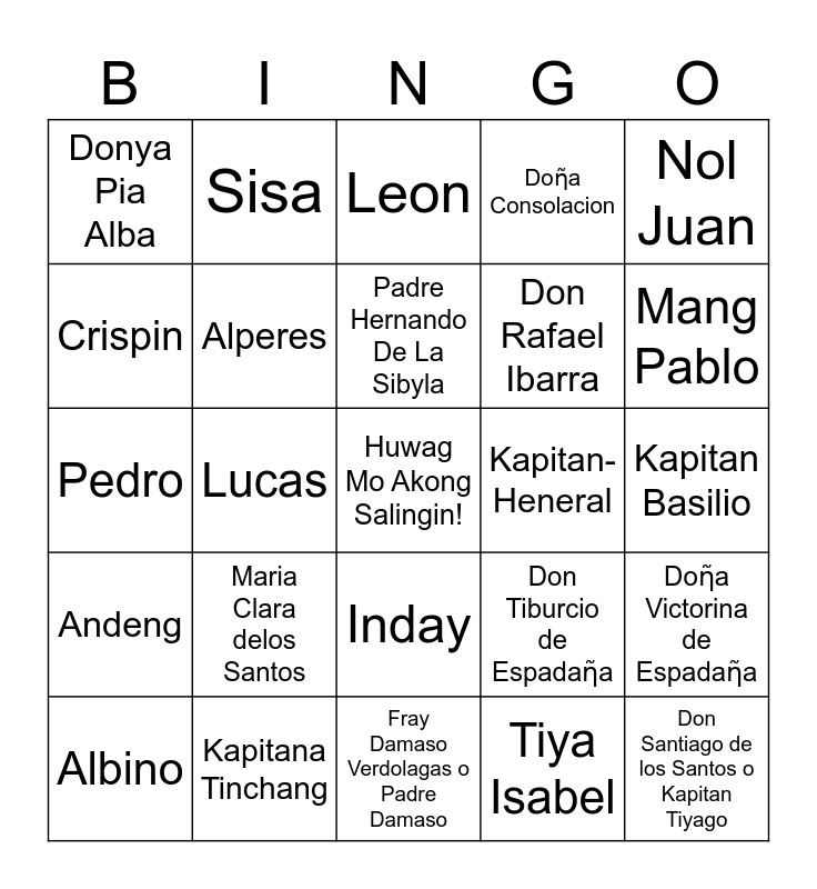 This bingo card has a free space and 49 words: Juan Crisostomo Magsalin Ibarra, Don Santiago de los Santos o Kapitan Tiyago, Elias, Fray Damaso Verdolagas o Padre Damaso, Maria Clara delos Santos, Don Anastacio o Pilosopo Tasyo, Sisa, Basilio, Crispin, Tinyente Guevarra, Alperes, Doῆa Consolacion, Doῆa Victorina de Espadaῆa, Don Tiburcio de Espadaῆa, Alfonso Linares, Padre Bernardo Salvi, Padre Hernando De La Sibyla, Kapitan-Heneral, Don Filipo, Nol Juan, Lucas, Tiya Isabel, Donya Pia Alba, Don Rafael Ibarra, Don Pedro Eibarramendia, Mang Pablo, Albino, Kapitana Maria, Inday, Andeng, Victoria, Neneng, Sinang, Hermana Rufa, Kapitana Tinchang, Padre Florentino, Don Saturnino Ibarra, Don Pedro Eibarramendia, Kapitan Basilio, Lucas, Mang Pablo, Balat, Tarsilo / Bruno, Kapitan Pablo, Pedro, Leon, Don Primitivo, Kapitan Tinong and Kapitan Valentin..