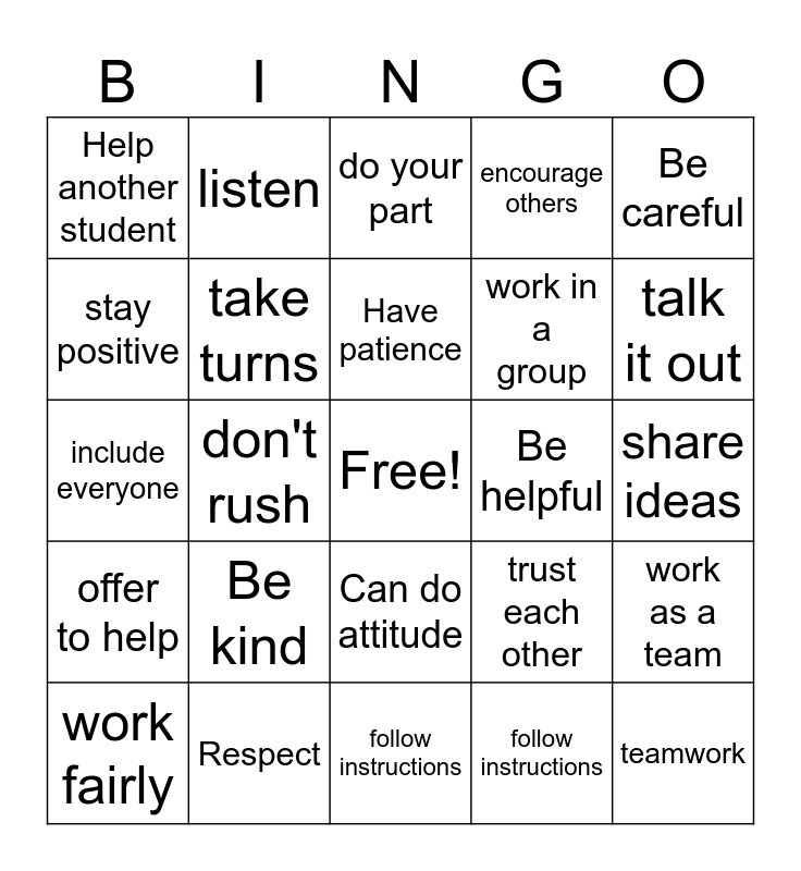 This bingo card has a free space and 24 words: Be kind, Respect, Have patience, work fairly, Be careful, Help another student, stay positive, listen, Be helpful, Can do attitude, work in a group, include everyone, trust each other, work as a team, take turns, follow instructions, share ideas, do your part, talk it out, don't rush, teamwork, offer to help, encourage others and follow instructions.