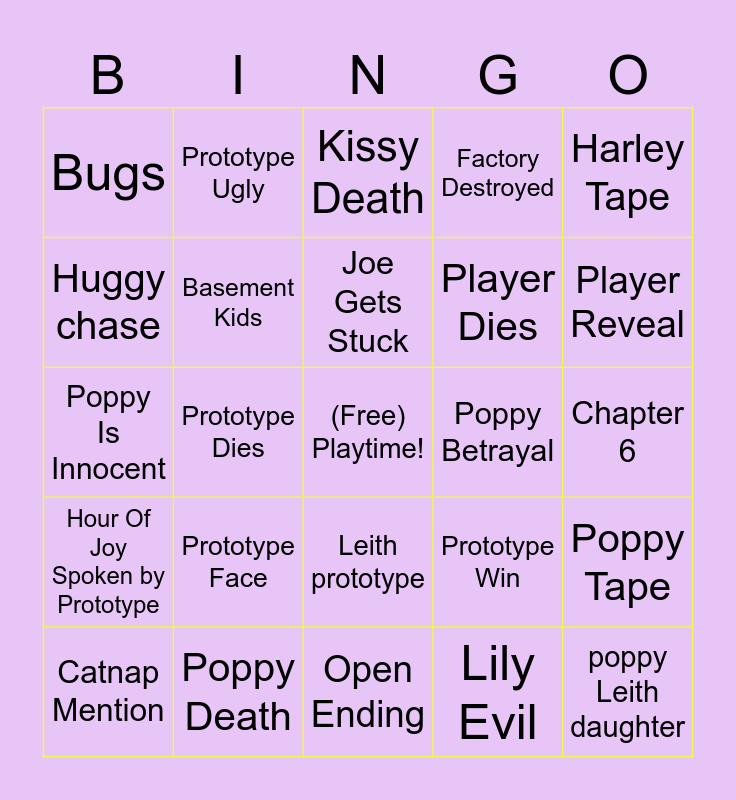 This bingo card has a free space and 24 words: Prototype Face, Poppy Death, Joe Gets Stuck, Catnap Mention, Harley Tape, Bugs, Huggy chase, Prototype Ugly, Poppy Betrayal, Leith prototype, Player Dies, Poppy Is Innocent, Prototype Win, Poppy Tape, Basement Kids, Lily Evil, Chapter 6, Kissy Death, Player Reveal, Prototype Dies, poppy Leith daughter, Hour Of Joy Spoken by Prototype, Factory Destroyed and Open Ending.