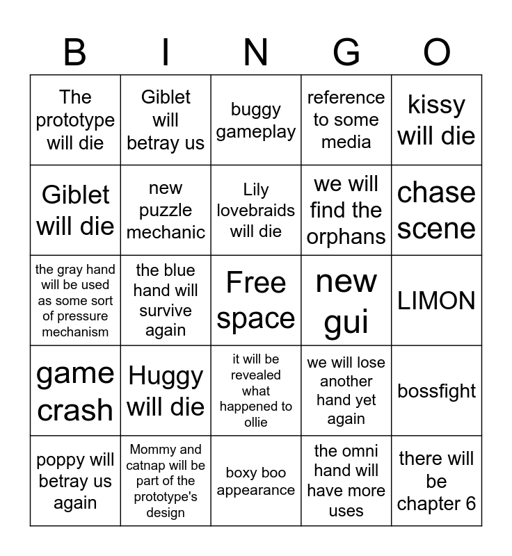 This bingo card has a free space and 24 words: Huggy will die, Mommy and catnap will be part of the prototype's design, Lily lovebraids will die, poppy will betray us again, kissy will die, The prototype will die, Giblet will die, Giblet will betray us, new gui, it will be revealed what happened to ollie, we will find the orphans, the gray hand will be used as some sort of pressure mechanism, we will lose another hand yet again, bossfight, new puzzle mechanic, the omni hand will have more uses, LIMON, buggy gameplay, chase scene, the blue hand will survive again, there will be chapter 6, game crash, reference to some media and boxy boo appearance.