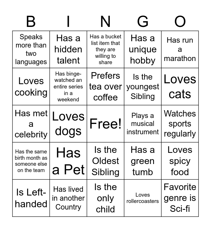 This bingo card has a free space and 24 words: Has a Pet, Has lived in another Country, Prefers tea over coffee, Is Left-handed, Has run a marathon, Speaks more than two languages, Loves cooking, Has a hidden talent, Plays a musical instrument, Is the Oldest Sibling, Is the youngest Sibling, Has met a celebrity, Has a green tumb, Loves spicy food, Has binge-watched an entire series in a weekend, Loves rollercoasters, Watches sports regularly, Has a bucket list item that they are willing to share, Loves cats, Loves dogs, Favorite genre is Sci-fi, Has the same birth month as someone else on the team, Has a unique hobby and Is the only child.