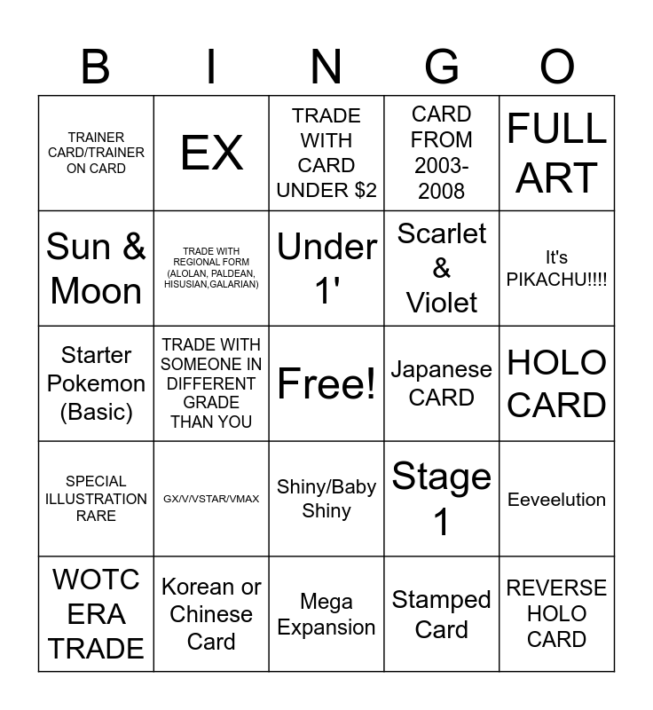 This bingo card has a free space and 29 words: WOTC ERA TRADE, 2 FOR 1 TRADE, TRADE WITH SOMEONE IN DIFFERENT GRADE THAN YOU, Original 151 Pokemon, TRAINER CARD/TRAINER ON CARD, TRADE WITH CARD UNDER $2, TRADE WITH REGIONAL FORM (ALOLAN, PALDEAN, HISUSIAN,GALARIAN), GX/V/VSTAR/VMAX, Japanese CARD, Korean or Chinese Card, HOLO CARD, REVERSE HOLO CARD, Mega Expansion, Stamped Card, It's PIKACHU!!!!, PROMO CARD (ANY), Shiny/Baby Shiny, SPECIAL ILLUSTRATION RARE, FULL ART, Starter Pokemon (Basic), Stage 1, Sword & Shield, Scarlet & Violet, Sun & Moon, CARD FROM 2003-2008, EX, Eeveelution, Under 1' and Tera Type.