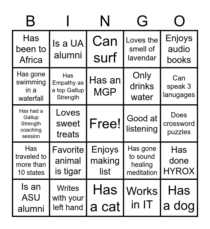 This bingo card has a free space and 34 words: Enjoys video games, Works in IT, Has done Toastmasters, Has a pet lizard, Has traveled to more than 10 states, Has Empathy as a top Gallup Strength, Enjoys audio books, Is an ASU alumni, Is a UA alumni, Works in PD, Has an MGP, Can surf, Has seen Game of Thrones more than once, Enjoys presenting, Good at listening, Can speak 3 lanugages, Writes with your left hand, Has had a Gallup Strength coaching session, Favorite animal is tigar, Has gone to sound healing meditation, Enjoys making list, Can still ride a bike, Has been to Africa, Does crossword puzzles, Has a cat, Has a dog, Loves the smell of lavendar, Prefers Android over Apple, Only drinks water, Has gone swimming in a waterfall, Has been to the Big Island, Loves sweet treats, Has done HYROX and Works in Public Safety.