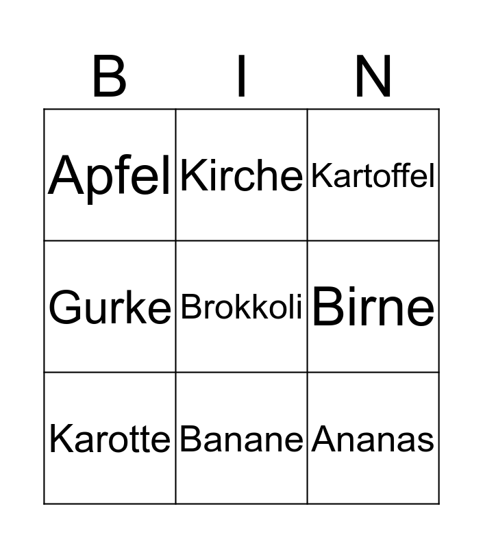 This bingo card has 9 words: Karotte, Kartoffel, Kirche, Gurke, Apfel, Birne, Brokkoli, Ananas and Banane.
