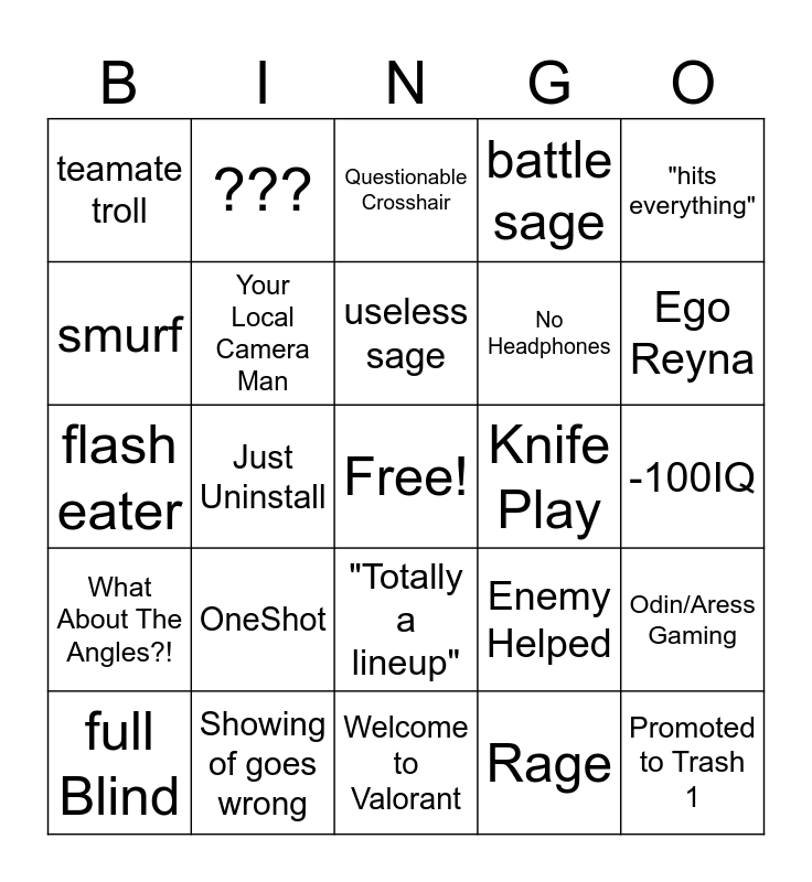 This bingo card has a free space and 24 words: OneShot, Showing of goes wrong, useless sage, full Blind, "hits everything", teamate troll, smurf, ???, Knife Play, "Totally a lineup", No Headphones, flash eater, Enemy Helped, Odin/Aress Gaming, Your Local Camera Man, Rage, -100IQ, Questionable Crosshair, Ego Reyna, Just Uninstall, Promoted to Trash 1, What About The Angles?!, battle sage and Welcome to Valorant.