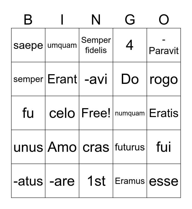 This bingo card has a free space and 24 words: Amo, -are, -avi, -atus, -Paravit, saepe, semper, umquam, numquam, cras, Do, fu, futurus, fui, Erant, Eramus, Eratis, Semper fidelis, rogo, celo, esse, unus, 4 and 1st.