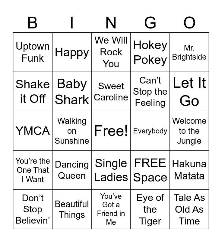 This bingo card has a free space and 25 words: Dancing Queen, You’ve Got a Friend in Me, Sweet Caroline, Don’t Stop Believin’, Mr. Brightside, Uptown Funk, Shake it Off, Happy, Everybody, Single Ladies, Can’t Stop the Feeling, YMCA, FREE Space, Hakuna Matata, Baby Shark, Old Town Road, Welcome to the Jungle, We Will Rock You, Let It Go, Walking on Sunshine, Tale As Old As Time, Beautiful Things, You’re the One That I Want, Hokey Pokey and Eye of the Tiger.
