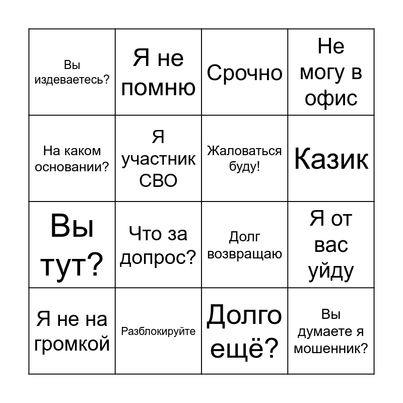 This bingo card has 16 words: Разблокируйте, Я от вас уйду, Срочно, Вы издеваетесь?, Вы тут?, Я не помню, Долг возвращаю, Долго ещё?, На каком основании?, Я участник СВО, Я не на громкой, Не могу в офис, Что за допрос?, Казик, Жаловаться буду! and Вы думаете я мошенник?.