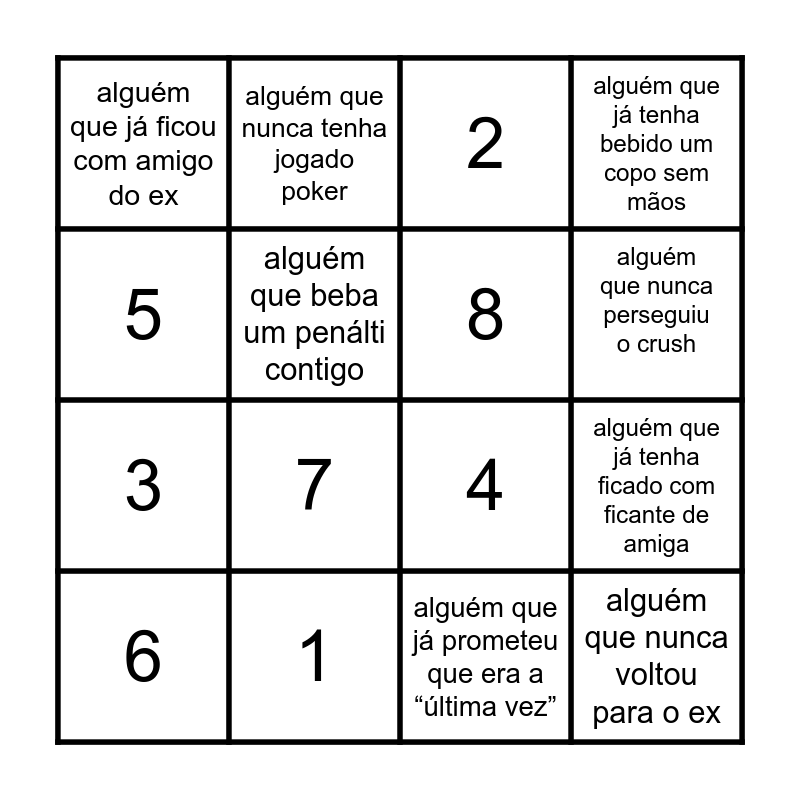 This bingo card has 16 words: 1, alguém que já tenha ficado com ficante de amiga, 2, alguém que já ficou com amigo do ex, 3, alguém que nunca tenha jogado poker, 4, alguém que já prometeu que era a “última vez”, 5, alguém que beba um penálti contigo, 6, alguém que já tenha bebido um copo sem mãos, 7, alguém que nunca perseguiu o crush, 8 and alguém que nunca voltou para o ex.