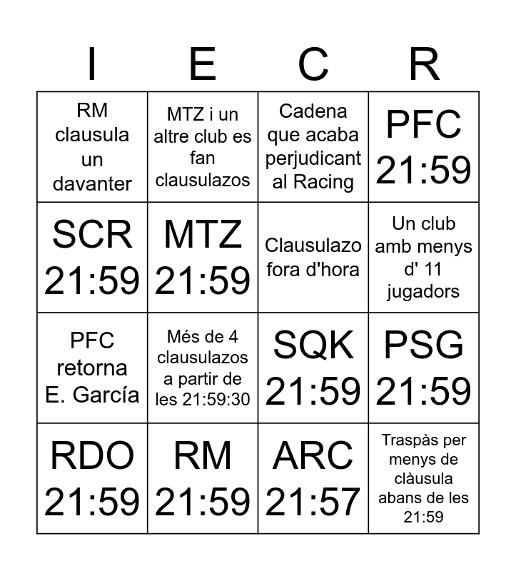 This bingo card has 16 words: RM 21:59, PSG 21:59, Cadena que acaba perjudicant al Racing, RM clausula un davanter, PFC retorna E. García, MTZ i un altre club es fan clausulazos, SQK 21:59, ARC 21:57, SCR 21:59, MTZ 21:59, RDO 21:59, PFC 21:59, Més de 4 clausulazos a partir de les 21:59:30, Un club amb menys d' 11 jugadors, Clausulazo fora d'hora and Traspàs per menys de clàusula abans de les 21:59.