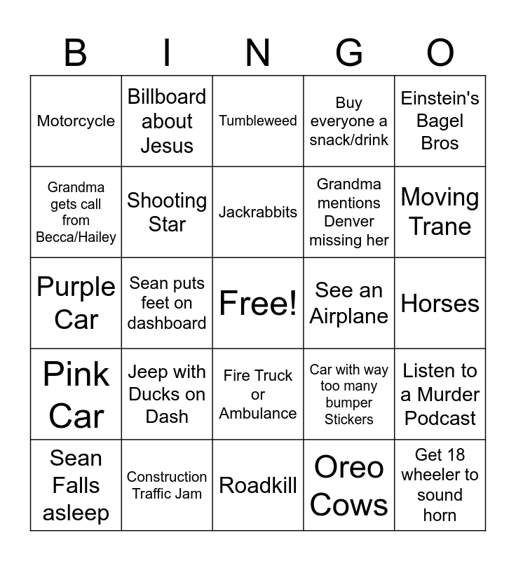 This bingo card has a free space and 34 words: First to see a Cop (each one), Oreo Cows, Exotic Animal, Windmill, Pink Car, Shooting Star, Einstein's Bagel Bros, Sean Falls asleep, Billboard about Jesus, No other cars in sight either direction, Jackrabbits, Tumbleweed, Truck hauling a Boat, Out of State License Plate, See an Airplane, Moving Trane, Construction Traffic Jam, Purple Car, Jeep with Ducks on Dash, Car with way too many bumper Stickers, Fire Truck or Ambulance, Volcano, Motorcycle, Horses, Roadkill, Get 18 wheeler to sound horn, Buy everyone a snack/drink, See a Landcruiser, Grandma mentions Denver missing her, Grandma gets call from Becca/Hailey, Temperature below 40, Sean puts feet on dashboard, Listen to a Murder Podcast and Tell a Joke.