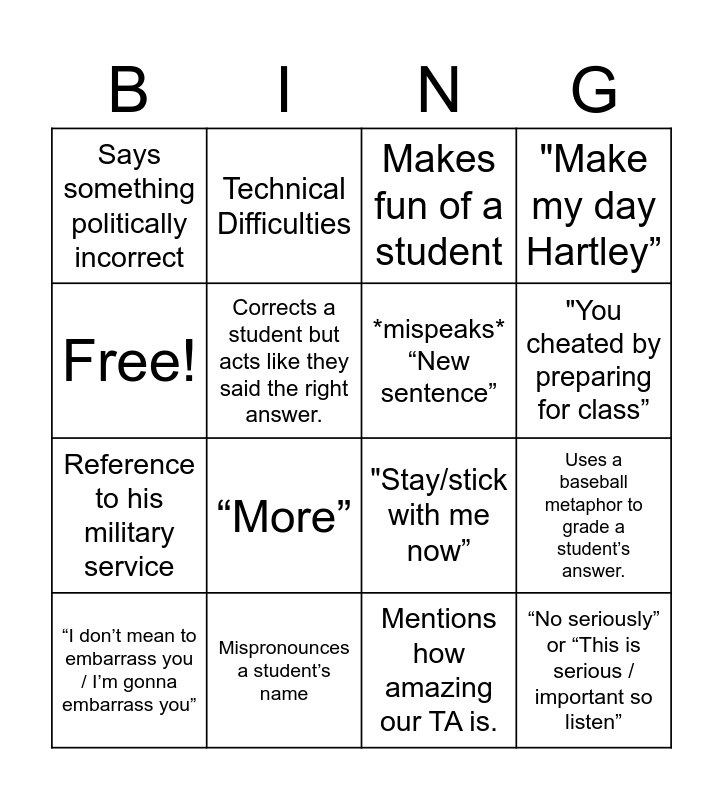This bingo card has 16 words: Mispronounces a student’s name, Uses a baseball metaphor to grade a student’s answer., Makes fun of a student, Says something politically incorrect, Reference to his military service, Technical Difficulties, "Stay/stick with me now”, Mentions how amazing our TA is., Free!, Corrects a student but acts like they said the right answer., “I don’t mean to embarrass you / I’m gonna embarrass you”, "Make my day Hartley”, “More”, "You cheated by preparing for class”, *mispeaks* “New sentence” and “No seriously” or “This is serious / important so listen”.