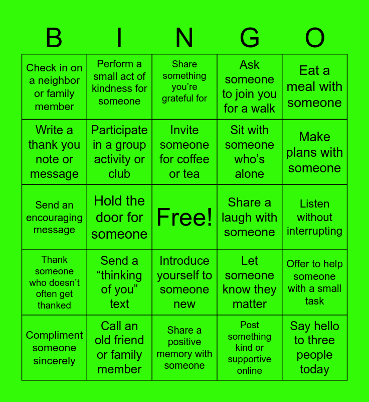 This bingo card has a free space and 24 words: Send a “thinking of you” text, Call an old friend or family member, Invite someone for coffee or tea, Compliment someone sincerely, Eat a meal with someone, Check in on a neighbor or family member, Write a thank you note or message, Perform a small act of kindness for someone, Share a laugh with someone, Introduce yourself to someone new, Sit with someone who’s alone, Send an encouraging message, Let someone know they matter, Offer to help someone with a small task, Participate in a group activity or club, Post something kind or supportive online, Listen without interrupting, Share something you’re grateful for, Make plans with someone, Hold the door for someone, Say hello to three people today, Thank someone who doesn’t often get thanked, Ask someone to join you for a walk and Share a positive memory with someone.