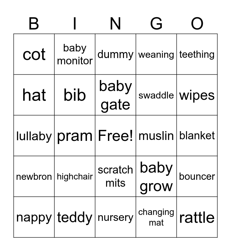 This bingo card has a free space and 29 words: nappy, bottle, pram, milk, cot, dummy, bib, highchair, muslin, teddy, blanket, rattle, nursery, changing mat, wipes, car seat, scratch mits, newbron, teething, lullaby, baby grow, sleep suit, swaddle, hat, weaning, baby monitor, bouncer, baby gate and book.