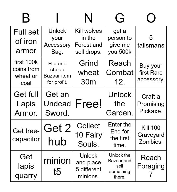 This bingo card has a free space and 24 words: Get 2 hub, minion t5, Grind wheat 30m, Get lapis quarry, 5 talismans, Full set of iron armor, first 100k coins from wheat or coal, Unlock your Accessory Bag., Unlock the Garden., Collect 10 Fairy Souls., Reach Combat 12., Get full Lapis Armor., Enter the End for the first time., Kill 100 Graveyard Zombies., Flip one cheap Bazaar item for profit., Unlock the Bazaar and sell something there., Craft a Promising Pickaxe., Kill wolves in the Forest and sell drops., Buy your first Rare accessory., Get an Undead Sword., Reach Foraging 7, Get tree-capacitor, get a person to give me you 500k and Unlock and place 5 different minions..