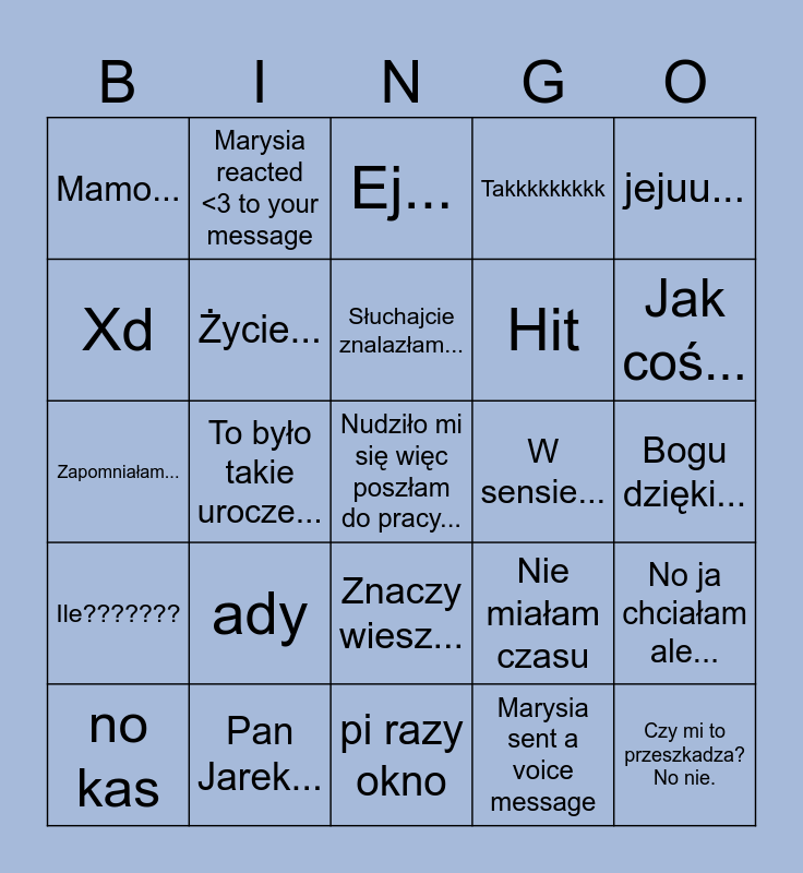 This bingo card has 25 words: ady, pi razy okno, Słuchajcie znalazłam..., no kas, jejuu..., Mamo..., Xd, Marysia reacted <3 to your message, W sensie..., Znaczy wiesz..., Hit, Zapomniałam..., Nie miałam czasu, No ja chciałam ale..., Życie..., Czy mi to przeszkadza? No nie., Bogu dzięki..., Ej..., Jak coś..., To było takie urocze..., Nudziło mi się więc poszłam do pracy..., Pan Jarek..., Ile???????, Takkkkkkkkk and Marysia sent a voice message.