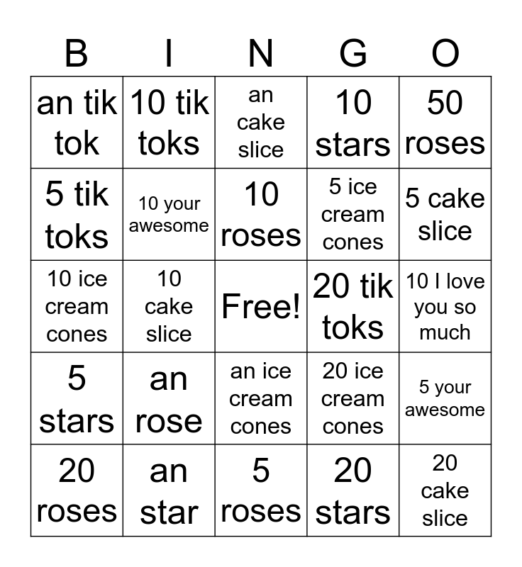 This bingo card has a free space and 25 words: an rose, 5 roses, 10 roses, 20 roses, 50 roses, an tik tok, 5 tik toks, 10 tik toks, 20 tik toks, an ice cream cones, 5 ice cream cones, 10 ice cream cones, 20 ice cream cones, 5 your awesome, 10 your awesome, 5 I love you so much, 10 I love you so much, an cake slice, 5 cake slice, 10 cake slice, 20 cake slice, an star, 5 stars, 10 stars and 20 stars.