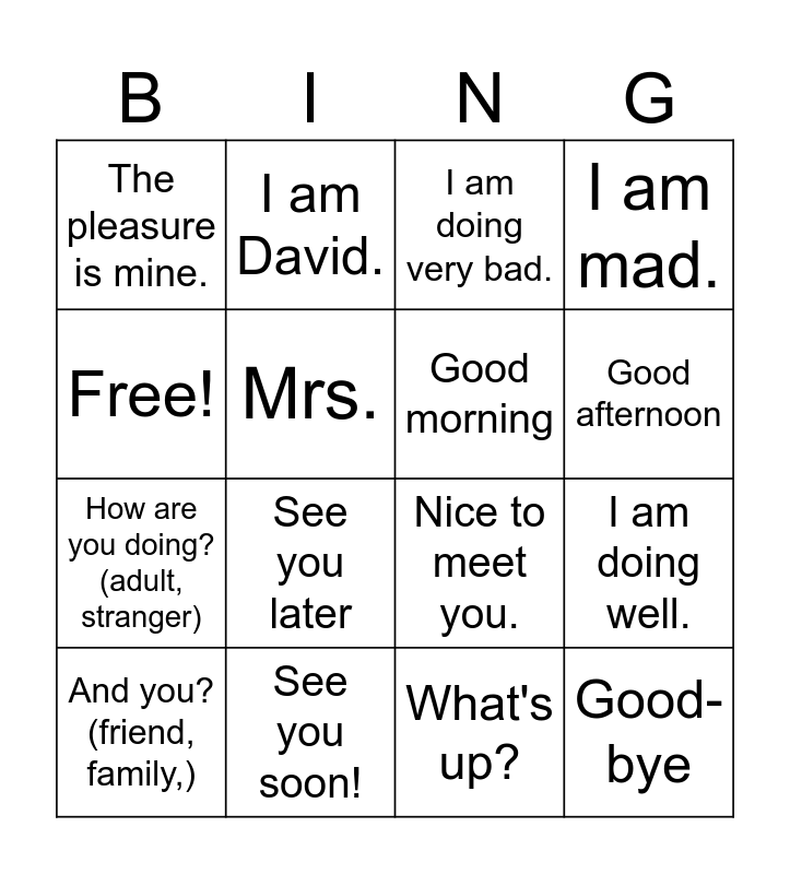 This bingo card has 16 words: See you soon!, I am doing well., I am doing very bad., The pleasure is mine., How are you doing? (adult, stranger), I am David., Nice to meet you., What's up?, Free!, Mrs., And you? (friend, family,), I am mad., See you later, Good afternoon, Good morning and Good-bye.