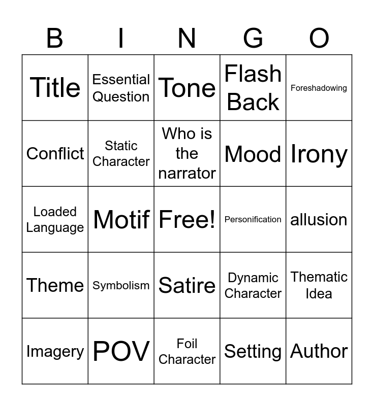 This bingo card has a free space and 24 words: Imagery, Symbolism, Who is the narrator, Setting, Foreshadowing, Title, Essential Question, Tone, Personification, allusion, Loaded Language, Static Character, Dynamic Character, Thematic Idea, Conflict, POV, Foil Character, Flash Back, Irony, Theme, Motif, Satire, Mood and Author.