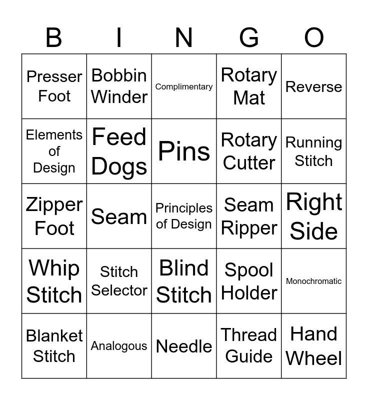 This bingo card has 25 words: Stitch Selector, Needle, Pins, Blanket Stitch, Reverse, Presser Foot, Elements of Design, Bobbin Winder, Seam Ripper, Blind Stitch, Rotary Cutter, Zipper Foot, Spool Holder, Monochromatic, Feed Dogs, Hand Wheel, Right Side, Complimentary, Running Stitch, Seam, Principles of Design, Analogous, Whip Stitch, Rotary Mat and Thread Guide.
