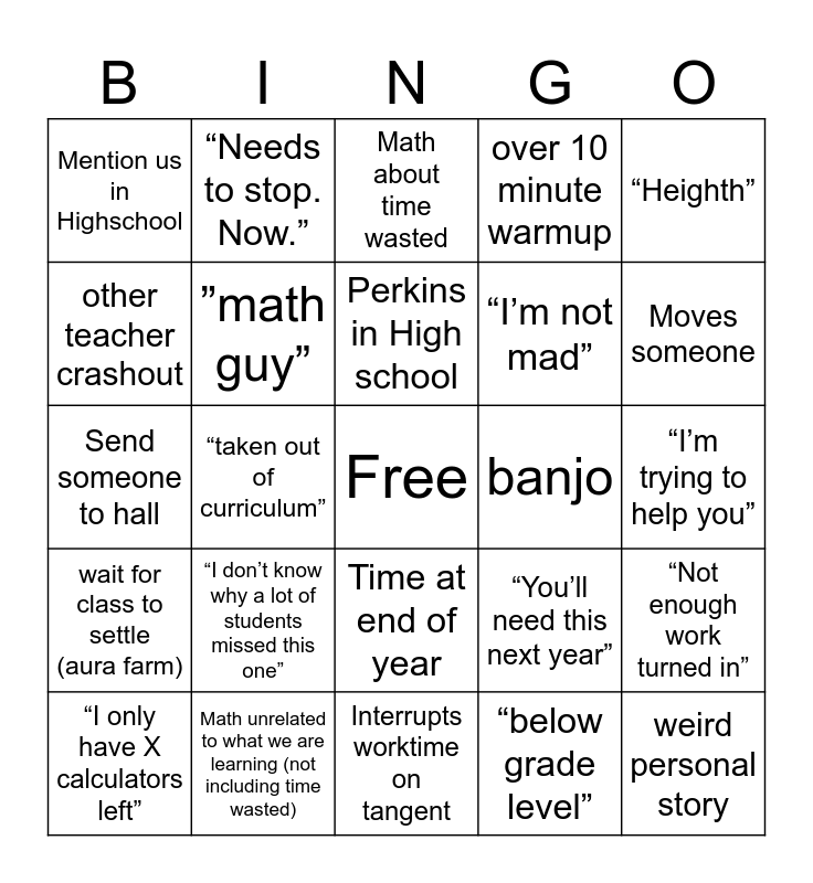 This bingo card has a free space and 35 words: “Tree”, “67”, “put yourself in a good spot”, ”math guy”, Time at end of year, over 10 minute warmup, other teacher crashout, talking crashout, Perkins in High school, College, Send someone to hall, “Heighth”, Previous jobs, Run out of calculators, Mention us in Highschool, banjo, “below grade level”, “taken out of curriculum”, wait for class to settle (aura farm), weird personal story, “You’ll need this next year”, “I only have X calculators left”, “Not enough work turned in”, Math unrelated to what we are learning (not including time wasted), Math about time wasted, Moves someone, Mad after no one says the answer right away, “Should’ve learned this last year”, “I’m not mad”, “I’m trying to help you”, “I was waiting for someone to get to that problem”, Interrupts worktime on tangent, “I don’t know why a lot of students missed this one”, “Needs to stop. Now.” and Joke mid notes (any).