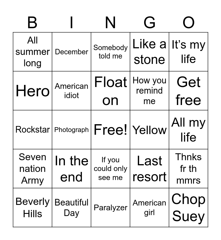 This bingo card has a free space and 58 words: Last night, Beautiful Day, I won’t back down, Seven nation Army, American girl, Best of you, American idiot, Californication, How you remind me, In the end, Like a stone, Sugar, we’re going down, Welcome to the Black Parade, In the middle, Are you gonna be my girl?, All summer long, Chop Suey, It’s my life, Hanging by a moment, Float on, Yellow, Somebody told me, Beverly Hills, Thnks fr th mmrs, Kryptonite, All my life, By the way, Teenagers, Get free, Renegades of Funk, The anthem, Stacy’s mom, I hate everything about you, The diary of Jane, Youth of the nation, Toxicity, Island in the sun, Photograph, Rockstar, She hates me, In the end, The reason, Last resort, One last breath, Self-esteem, Lips of an angel, It’s not over, If you could only see me, Paralyzer, Drive, I alone, Not meant to be, Let her cry, Push, December, Fight for your right, Hero and Blurry.