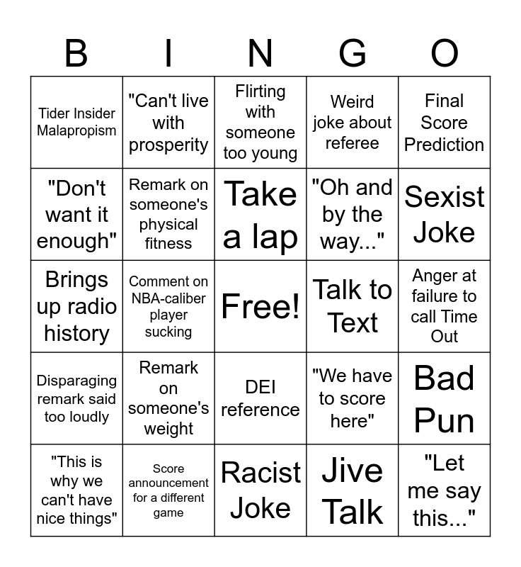 This bingo card has a free space and 26 words: DEI reference, Jive Talk, Take a lap, Score announcement for a different game, Final Score Prediction, Tider Insider Malapropism, "Don't want it enough", "Can't live with prosperity, Anger at failure to call Time Out, "We have to score here", "Oh and by the way...", Brings up radio history, Bad Pun, "This is why we can't have nice things", Comment on NBA-caliber player sucking, Yelling in Spanish, Weird joke about referee, Disparaging remark said too loudly, Flirting with someone too young, "Let me say this...", Sexist Joke, Racist Joke, Talk to Text, Remark on someone's weight, Remark on someone's physical fitness and Facebook reference.