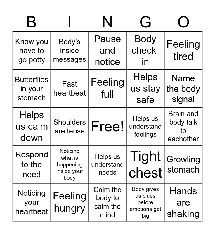 This bingo card has a free space and 24 words: Noticing what is happening inside your body, Feeling hungry, Feeling full, Noticing your heartbeat, Feeling tired, Know you have to go potty, Butterflies in your stomach, Body's inside messages, Helps us understand feelings, Helps us understand needs, Helps us stay safe, Helps us calm down, Tight chest, Growling stomach, Fast heartbeat, Body gives us clues before emotions get big, Brain and body talk to eachother, Pause and notice, Name the body signal, Shoulders are tense, Hands are shaking, Respond to the need, Body check-in and Calm the body to calm the mind.