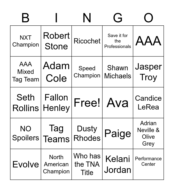 This bingo card has a free space and 24 words: Tag Teams, North American Champion, Speed Champion, Evolve, AAA, NXT Champion, AAA Mixed Tag Team, Robert Stone, Ava, Dusty Rhodes, Shawn Michaels, Seth Rollins, Paige, Adrian Neville & Olive Grey, Adam Cole, Kelani Jordan, Candice LeRea, Ricochet, Jasper Troy, Fallon Henley, Performance Center, NO Spoilers, Save it for the Professionals and Who has the TNA Title.