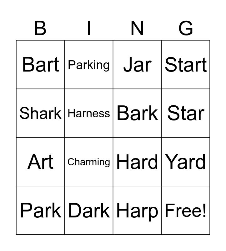 This bingo card has 23 words: Free!, Barn, Star, Card, Shark, Bart, Harness, Parking, Park, Charm, Charming, Art, Farm, Farming, Dark, March, Jar, Hard, Bark, Yard, Start, Harp and Charge.