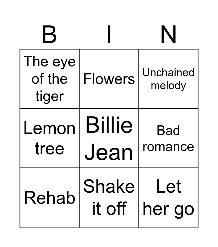 This bingo card has 15 words: Take on me, Can't touch this, Unchained melody, The eye of the tiger, Shake it off, Billie Jean, Stand by me, I gotta feeling, Bad romance, Let her go, Imagine, Lemon tree, Rehab, Flowers and Hotel California.