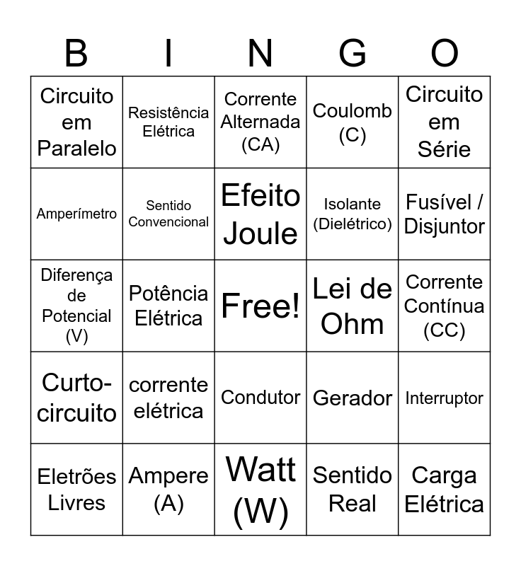 This bingo card has a free space and 24 words: corrente elétrica, Ampere (A), Efeito Joule, Eletrões Livres, Circuito em Série, Circuito em Paralelo, Amperímetro, Resistência Elétrica, Lei de Ohm, Condutor, Isolante (Dielétrico), Diferença de Potencial (V), Gerador, Interruptor, Sentido Convencional, Sentido Real, Corrente Contínua (CC), Corrente Alternada (CA), Fusível / Disjuntor, Potência Elétrica, Carga Elétrica, Curto-circuito, Coulomb (C) and Watt (W).