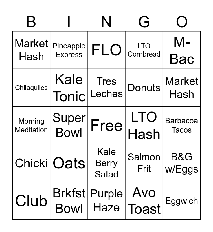 This bingo card has a free space and 24 words: Oats, Brkfst Bowl, Tres Leches, Club, M-Bac, Market Hash, Chilaquiles, Pineapple Express, LTO Hash, Kale Berry Salad, Donuts, Morning Meditation, Salmon Frit, B&G w/Eggs, Kale Tonic, Avo Toast, Barbacoa Tacos, FLO, Market Hash, Super Bowl, Eggwich, Chicki, LTO Cornbread and Purple Haze.