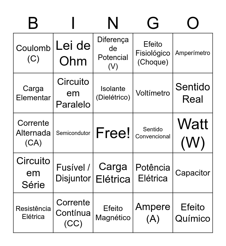 This bingo card has a free space and 34 words: corrente elétrica, Ampere (A), Efeito Joule, Eletrões Livres, Circuito em Série, Circuito em Paralelo, Amperímetro, Resistência Elétrica, Lei de Ohm, Condutor, Isolante (Dielétrico), Diferença de Potencial (V), Gerador, Interruptor, Sentido Convencional, Sentido Real, Corrente Contínua (CC), Corrente Alternada (CA), Fusível / Disjuntor, Potência Elétrica, Carga Elétrica, Curto-circuito, Coulomb (C), Watt (W), Efeito Magnético, Efeito Químico, Efeito Fisiológico (Choque), Multímetro, Voltímetro, Carga Elementar, Supercondutor, Semicondutor, Capacitor and Indutor.