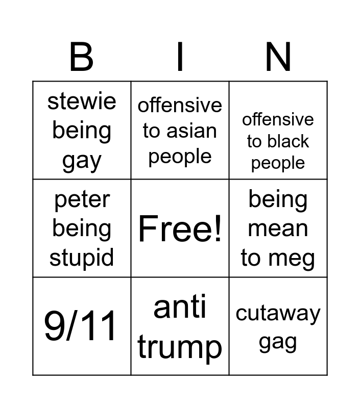 This bingo card has a free space and 8 words: being mean to meg, offensive to black people, offensive to asian people, 9/11, stewie being gay, cutaway gag, peter being stupid and anti trump.