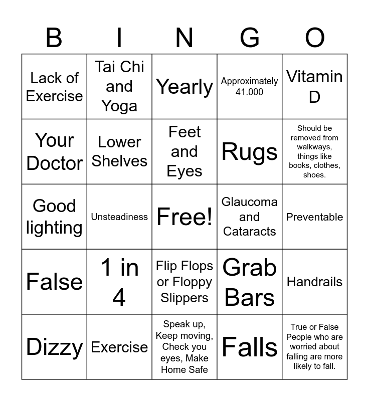 This bingo card has a free space and 24 words: 1 in 4, Exercise, Feet and Eyes, Dizzy, Vitamin D, Lack of Exercise, Your Doctor, Tai Chi and Yoga, Glaucoma and Cataracts, Flip Flops or Floppy Slippers, Rugs, Good lighting, Grab Bars, Handrails, Lower Shelves, Falls, Preventable, Yearly, Should be removed from walkways, things like books, clothes, shoes., Unsteadiness, True or False People who are worried about falling are more likely to fall., False, Approximately 41.000 and Speak up, Keep moving, Check you eyes, Make Home Safe.