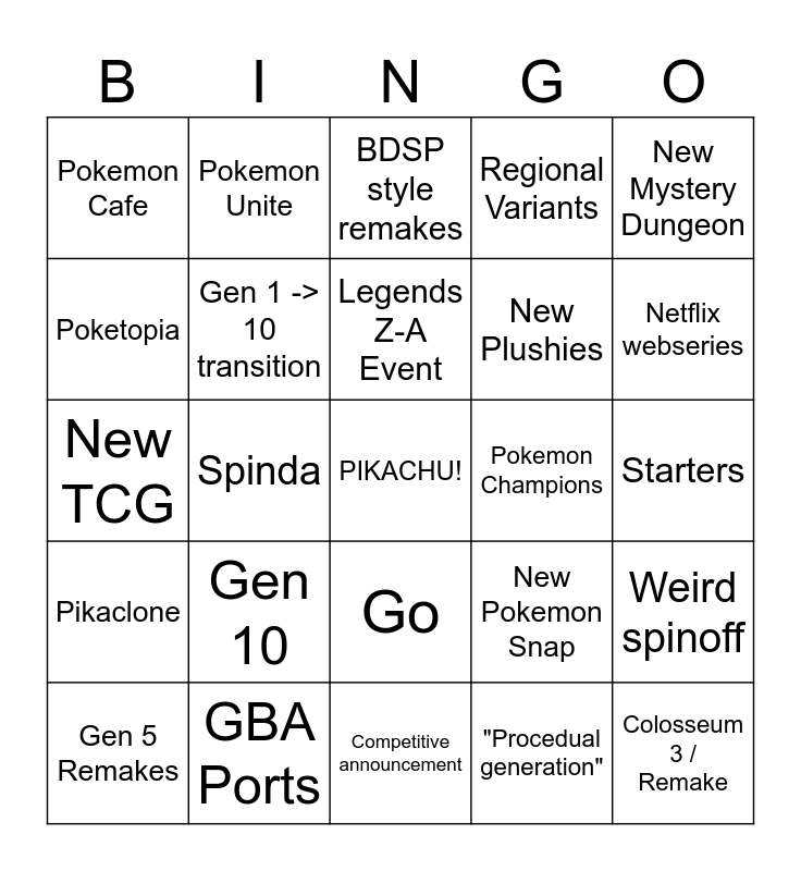 This bingo card has a free space and 24 words: Gen 10, GBA Ports, Legends Z-A Event, Gen 5 Remakes, New Mystery Dungeon, Pokemon Cafe, Poketopia, Pokemon Unite, Pokemon Champions, Go, New Plushies, New TCG, New Pokemon Snap, Weird spinoff, Gen 1 -> 10 transition, "Procedual generation", Starters, BDSP style remakes, Netflix webseries, Spinda, Colosseum 3 / Remake, Pikaclone, Regional Variants and Competitive announcement.