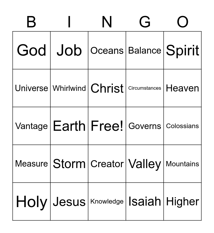 This bingo card has a free space and 24 words: Storm, Jesus, Christ, Holy, Spirit, God, Universe, Job, Governs, Creator, Circumstances, Vantage, Valley, Mountains, Whirlwind, Isaiah, Colossians, Oceans, Heaven, Earth, Higher, Measure, Balance and Knowledge.